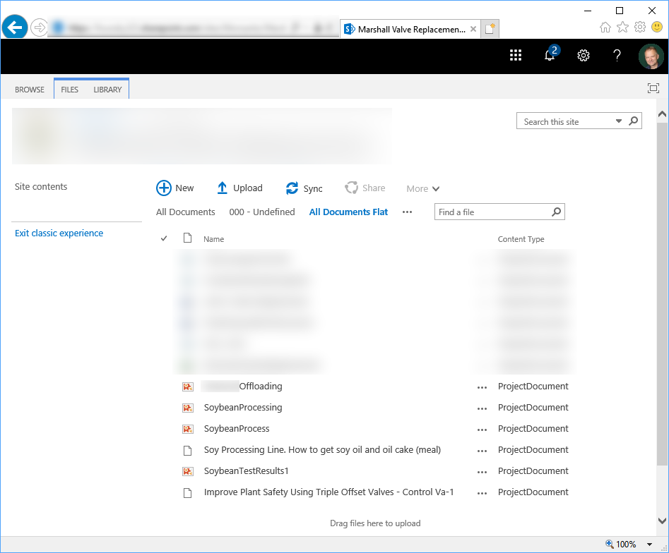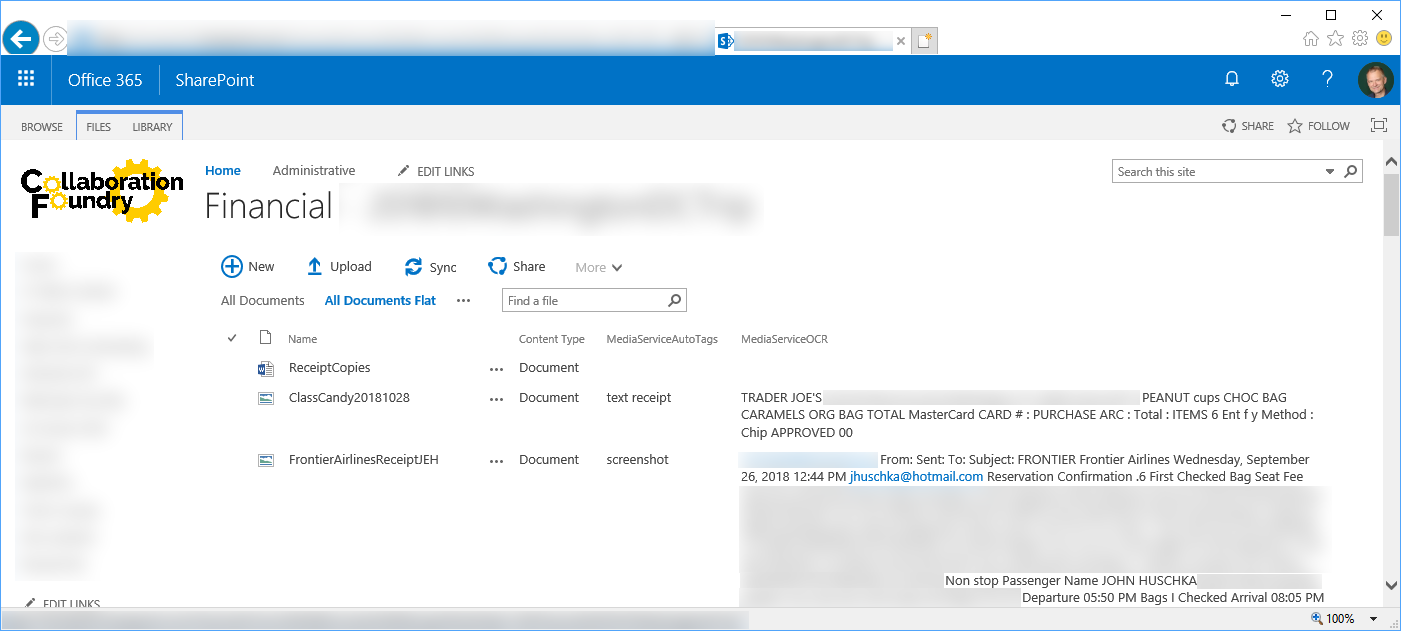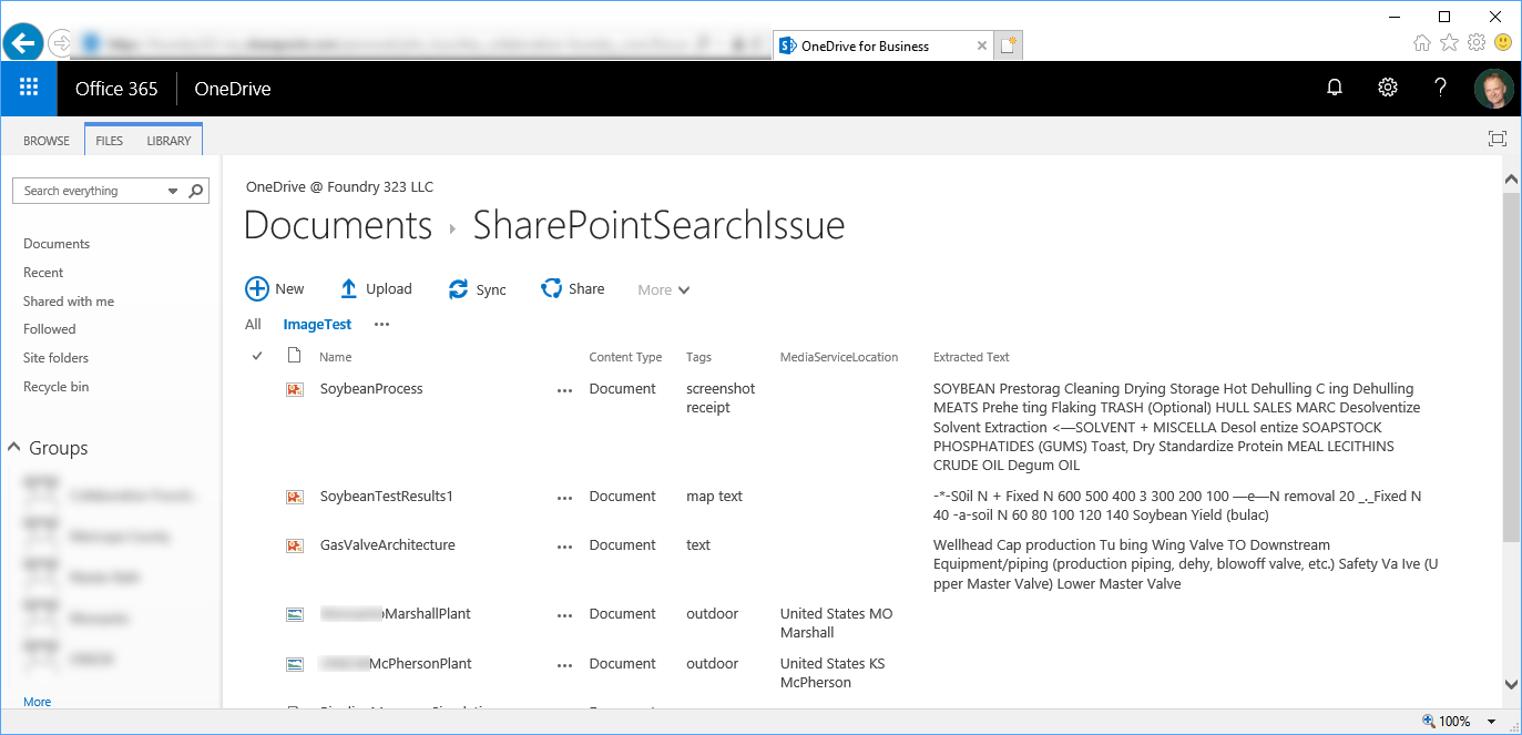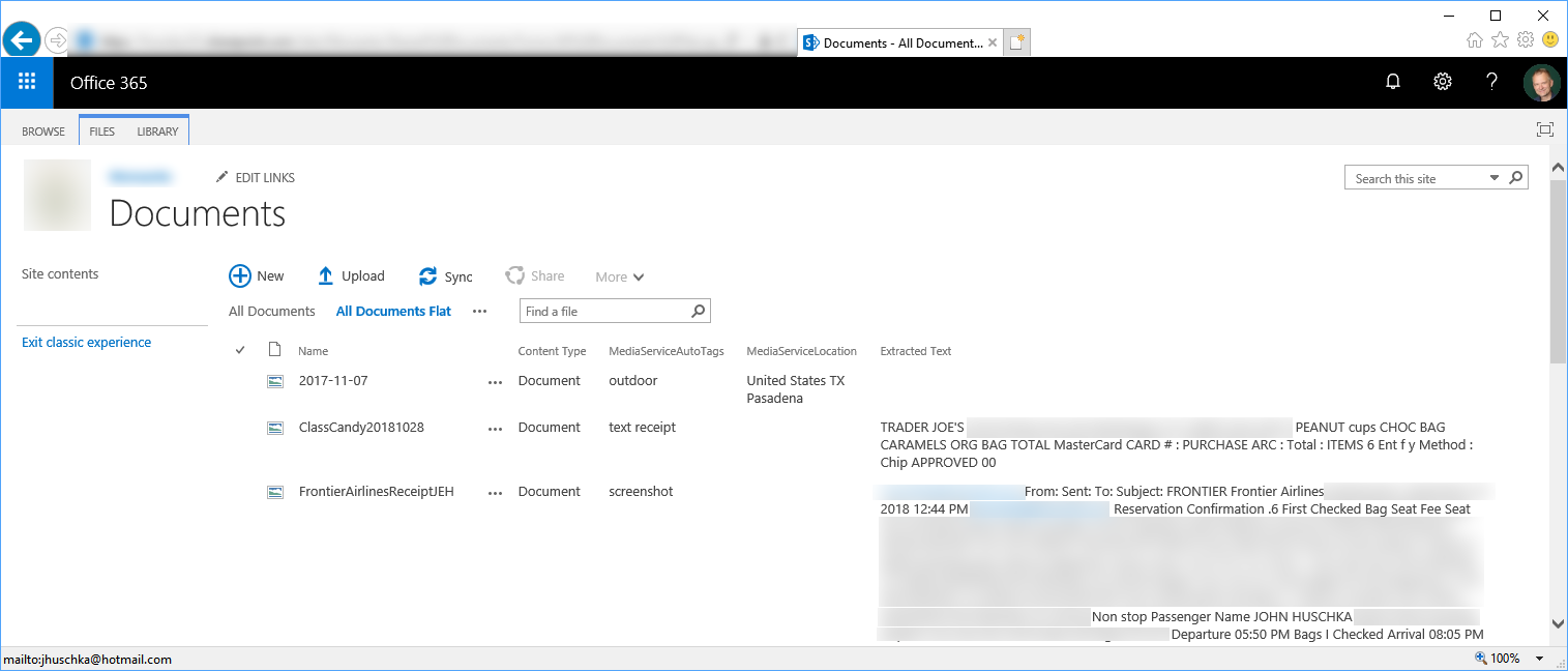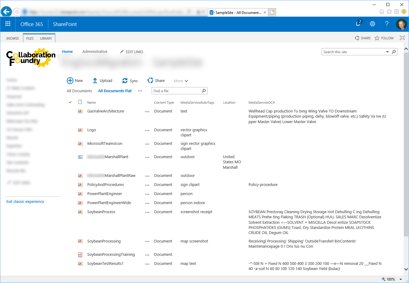 We uploaded our test files to a SharePoint classic site. We also added some additional files to flex O365's image analysis functionality. We used the out-of-the-box Document content type in a user-created library: